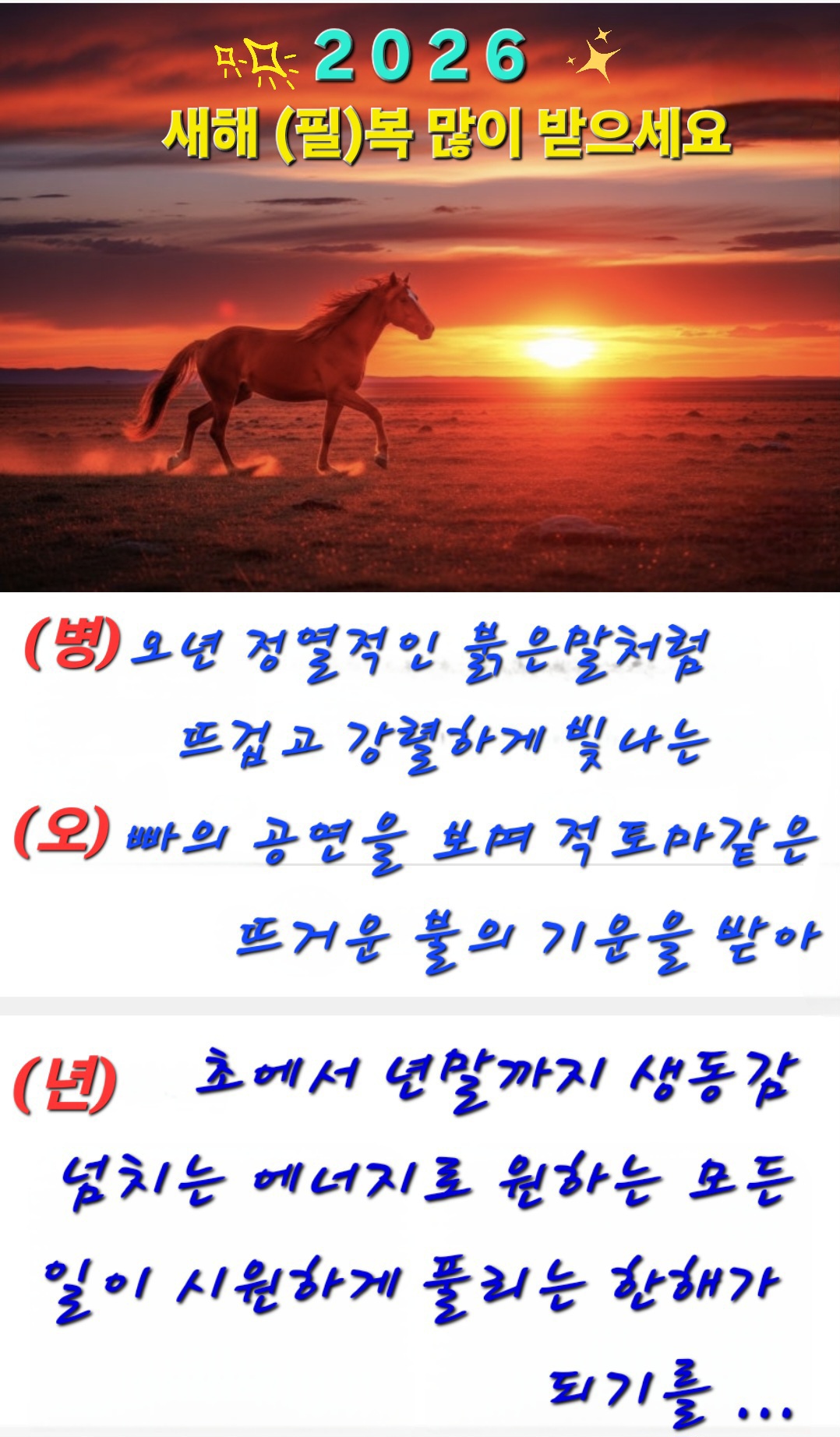 새희망을 품은 봄, 열정 가득한 여름, 결실을 맺는 가을, 지난날을 되돌아 보며 내일을 준비하는 겨울처럼 품었던 희망이 모두 다 결실을 맺어 이루어지길 바라며 사계절 내내 행복 행운복 사랑복 필복 듬뿍 받는 한해가 되기를 바랍니다